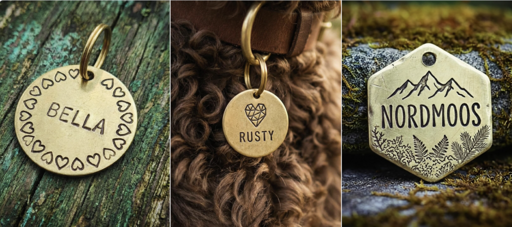 Sicherheit für deine Fellnase. Robuste Hunde-Anhänger mit Name & Telefonnummer – tief geprägt und gut lesbar.